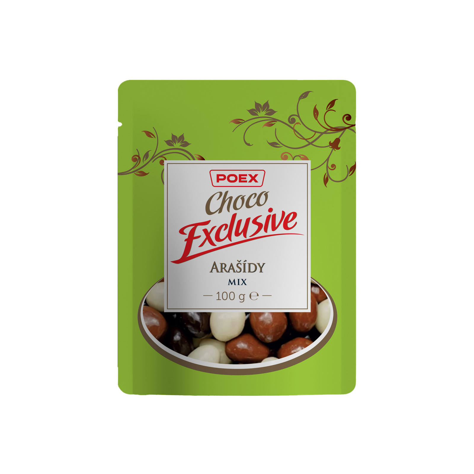 Směs pražených loupaných arašídů v bílé čokoládě, hořké čokoládě a mléčné čokoládě