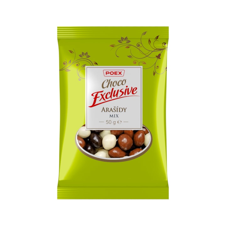 Směs pražených loupaných arašídů v bílé čokoládě, hořké čokoládě a mléčné čokoládě