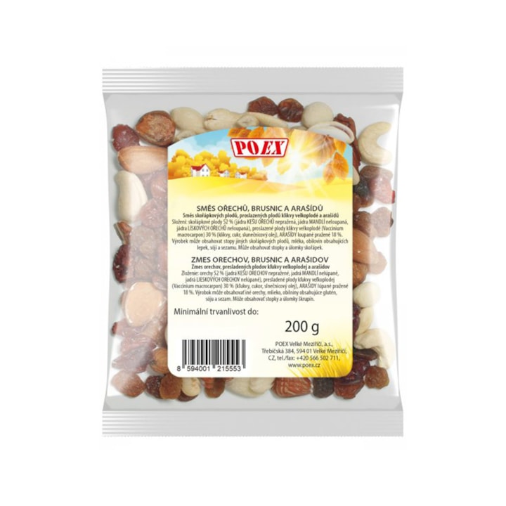 nuts 52 % (unroasted HAT NUTS kernels, unpeeled almond kernels, unpeeled hazelnut kernels), sweetened Vaccinium macrocarpon fruits 30 % (cranberries, sugar, sunflower oil), roasted peanuts 18 %.