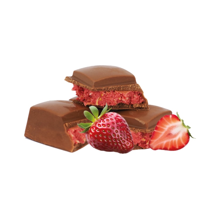 mléčná čokoláda 57 % (cukr, kakaové máslo, sušené MLÉKO, kakaová hmota, emulgátor: lecitiny; přírodní vanilkové aroma), jahodová náplň 43 % [cukr, olej z máslovníku, sušené MLÉKO, pečené nitě Kadayif 12 % (PŠENIČNÁ mouka, pitná voda), prášek z mrazem sušených jahod 9 %, sušený jahodový prášek 4 %, emulgátor: lecitiny; aroma].