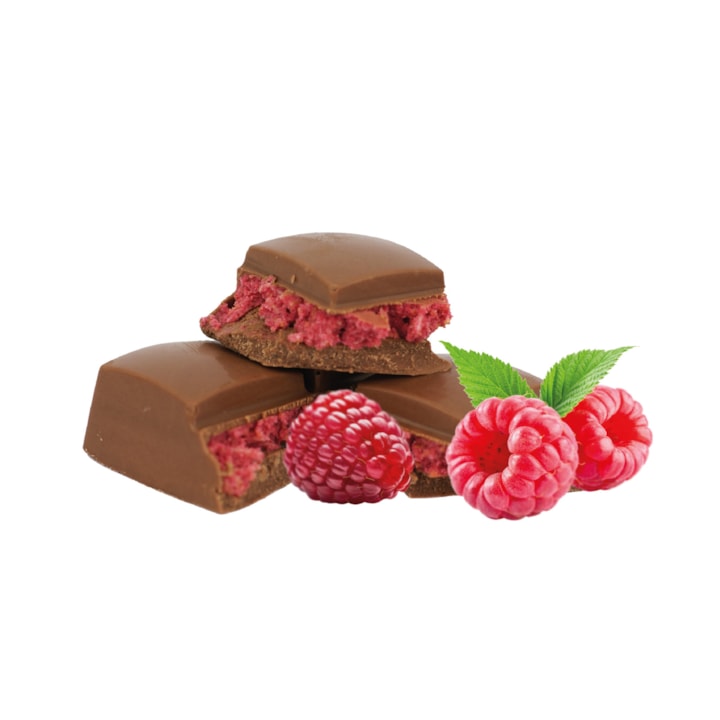 mléčná čokoláda 57 % (cukr, kakaové máslo, sušené MLÉKO, kakaová hmota, emulgátor: lecitiny; přírodní vanilkové aroma), malinová náplň 43 % [cukr, olej z máslovníku, sušená SYROVÁTKA, pečené nitě Kadayif 12 % (PŠENIČNÁ mouka, pitná voda), prášek z mrazem sušených malin 9 %, sušené MLÉKO, emulgátor: lecitiny; přírodní vanilkové aroma].