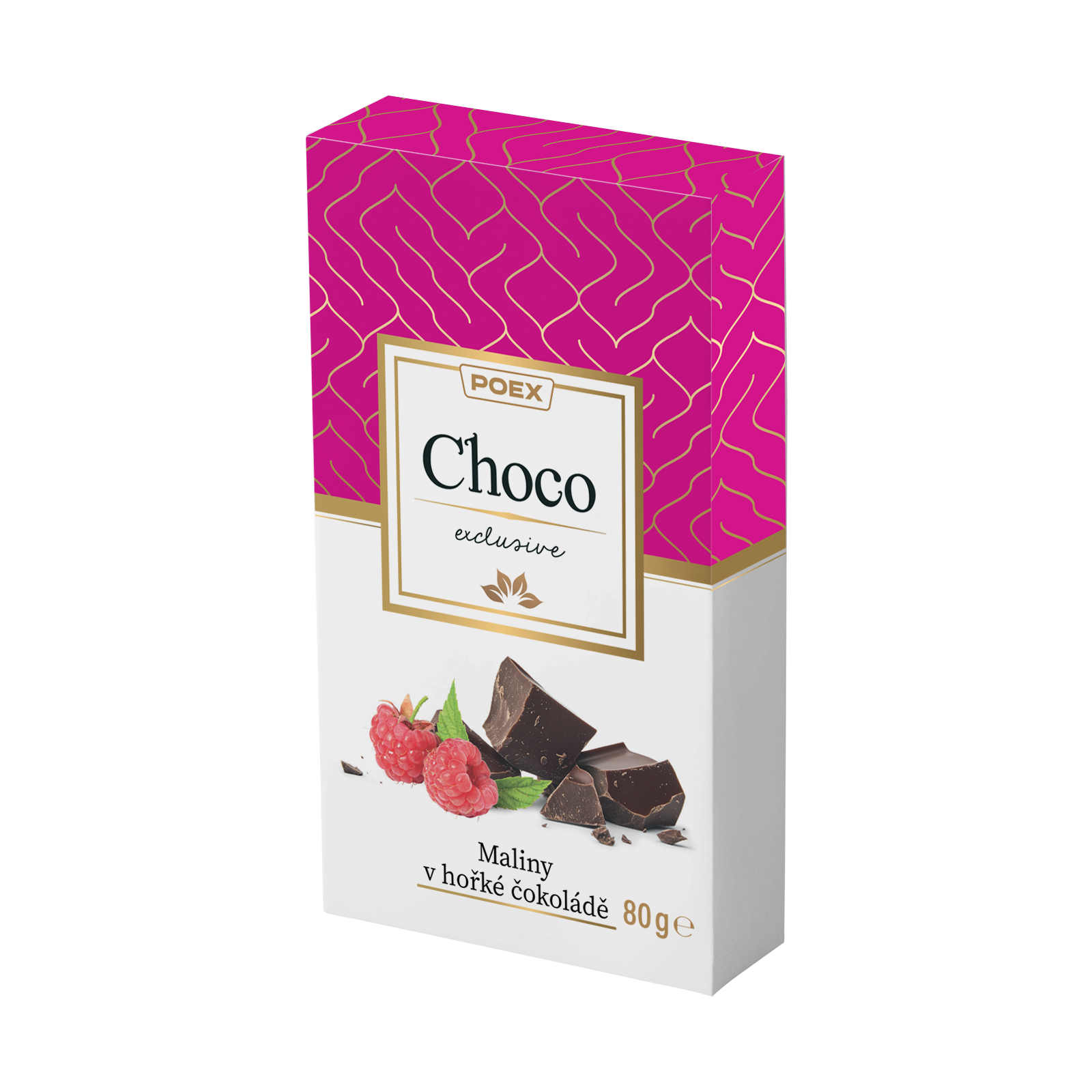 hořká čokoláda 90 % [cukr, kakaová hmota, rostlinné tuky (palmový olej, olej z máslovníku), sušený výrobek MLÉČNÉ SYROVÁTKY, MLÉČNÝ TUK, kakaové máslo, emulgátory: lecitiny a polyglycerylpolyricinoleát; přírodní aroma, sušené MLÉKO], mrazem sušené maliny 9 %, lešticí směs (tapiokový škrob, cukr, lešticí látka: šelak).